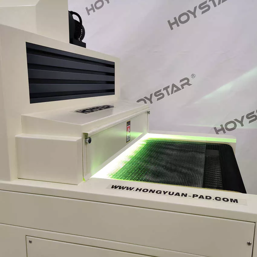 Möchten Sie eine günstige und hochwertige UV-Härtungsmaschine mit 1000 mm breitem Förderband kaufen? Liebe Kunden auf der ganzen Welt, Sie können dies gerne in unserer Fabrik in China kaufen. Diese HOYSTAR-UV-Härtungsmaschine mit 1000 mm breitem Förderband ist für Nachdruck-Härtungsprozesse mit UV-Tinte konzipiert. Es nutzt UV-Licht, um den UV-Tintenfilm sofort zu trocknen und auszuhärten. Das Gerät sorgt für eine effektive Trocknung der auf Papier, PVC und anderen weichen oder dünnen Substraten gedruckten UV-Tinte.