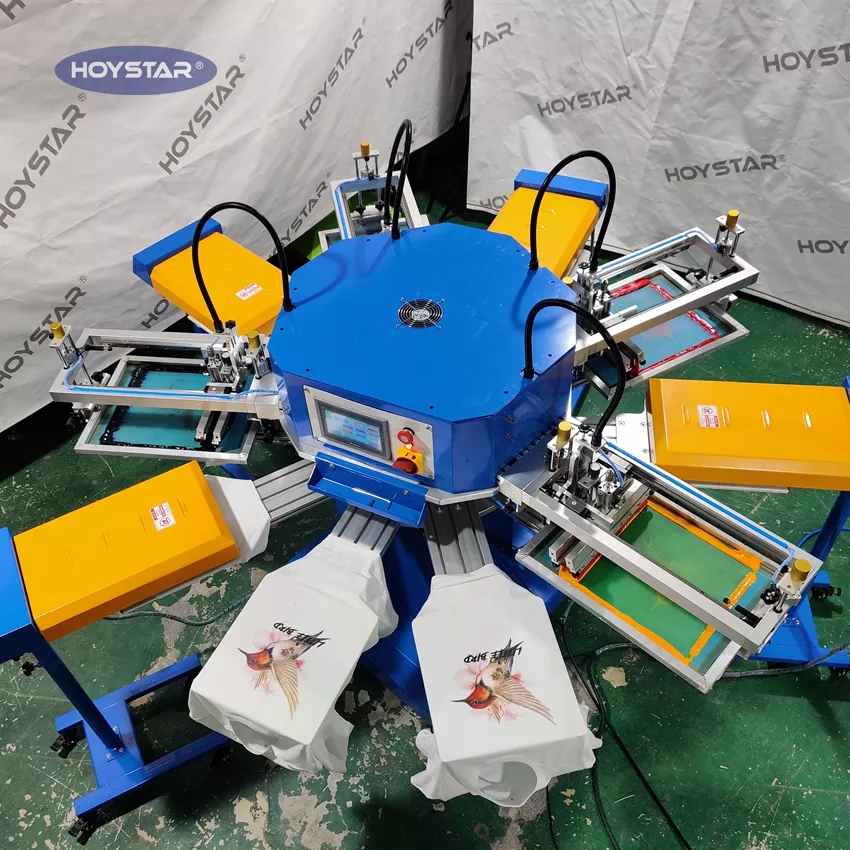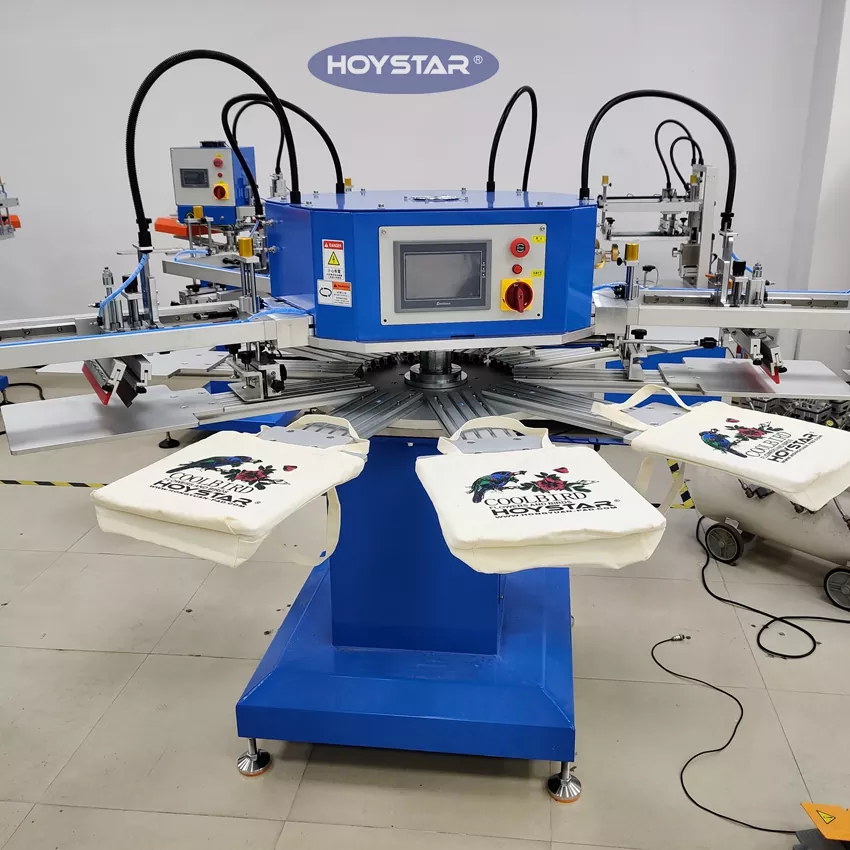Als professioneller Hersteller und Lieferant wurde diese automatische T-Shirt-Siebdruckmaschine für 4-Farben-Beutel von HOYSTAR speziell für die Textilindustrie entwickelt. Mit einer beeindruckenden Leistung von bis zu 1200 Stück pro Stunde können Sie Ihre Produktionseffizienz steigern. Design zum Drucken von Kleidungsetiketten, Etiketten und Taschen, kann die Vorrichtung zum Drucken verschiedener Produkttypen wechseln. Die Maschine verfügt über einen drehbaren Arbeitstisch, der ein schnelles und bequemes Be- und Entladen ermöglicht – wodurch Ausfallzeiten minimiert und der Durchsatz maximiert werden.
