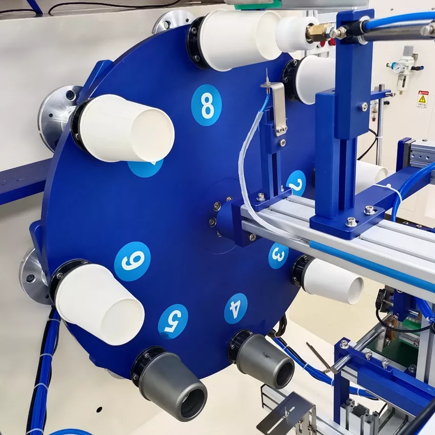 9. Positionierung an mehreren Stationen wird durch ein hochpräzises Rotationsindexsystem (hergestellt in Taiwan) erreicht, das Stabilität, Geschwindigkeit und verbesserte Effizienz gewährleistet.