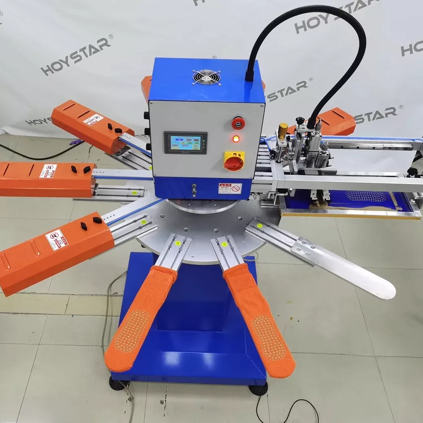 Als professioneller Hersteller in China möchten wir Ihnen die Hochgeschwindigkeits-Siebdruckmaschine HOYSTAR für Socken anbieten. Unsere Maschinen verfügen über eine SPS- und Touchscreen-Steuerung und werden hauptsächlich zum Bedrucken verschiedener Sockentypen verwendet. Das Gerät kann die Sohlen und Absätze der Socken bedrucken und ist mit einem Trockenofen ausgestattet, der das Silikon und die Tinte gut trocknen kann.