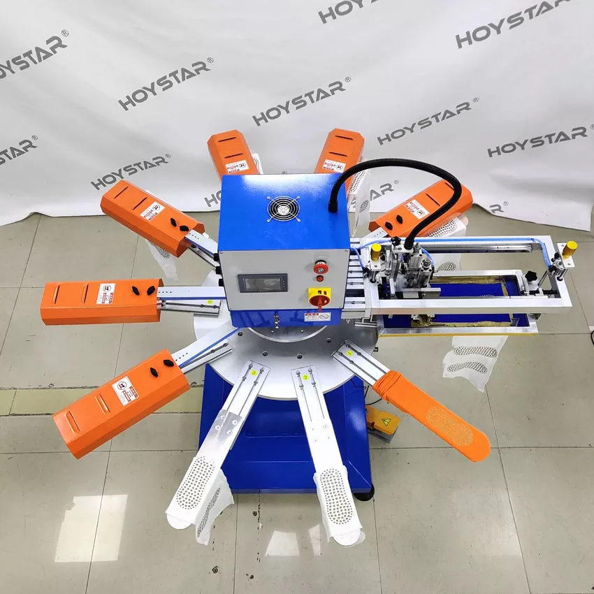 Als professioneller Hersteller und Lieferant ist die HOYSTAR Hochgeschwindigkeits-Siebdruckmaschine für Socken für Anwendungen in der Textilstrickindustrie konzipiert. Mit einer Geschwindigkeit von bis zu 1000 Stück pro Stunde eignet es sich zum Bedrucken von rutschfesten Socken, Babysocken, Erwachsenensocken, Fußballsocken usw. Ausgestattet mit einem drehbaren Arbeitstisch ist das Be- und Entladen von Socken sehr bequem. SPS-Touchscreen-Steuerung, sehr einfach zu bedienen. Mit einem Trocknungssystem ausgestattete Maschine kann das Silikon und die Tinte gut trocknen.