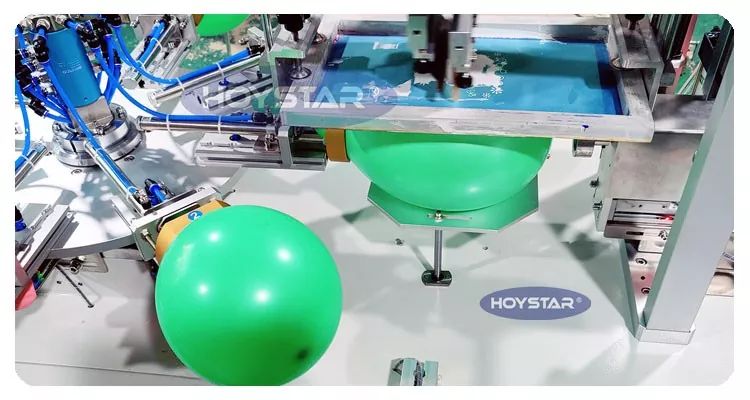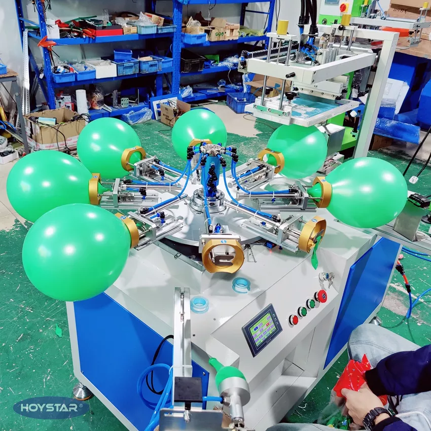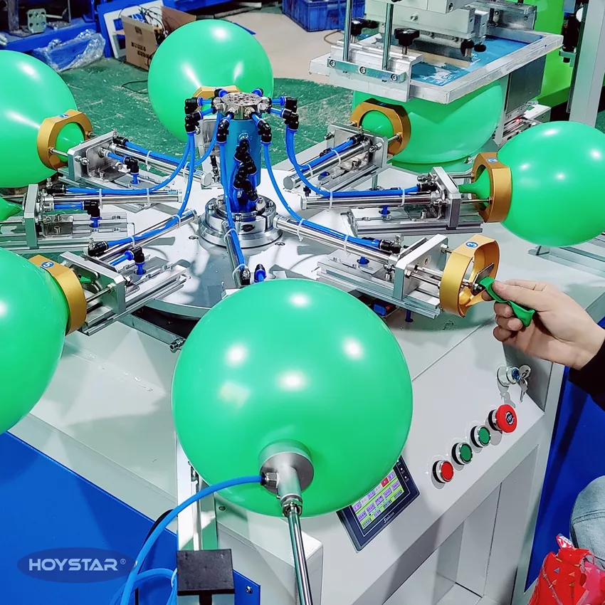 HOYSTAR ist ein zuverlässiger Hersteller und Lieferant in China; Diese einfarbige Siebdruckmaschine für Latexballons von HOYSTAR ist für den Druck auf Latexballons konzipiert. Ausgestattet mit rotierendem Arbeitstisch, automatischer Blas-, automatischer Rotations-, automatischer Trocknungs- und automatischer Entladefunktion. SPS-Touchscreen-Steuerung, benutzerfreundliche Oberfläche für sichere, intuitive Bedienung. Die Maschine vereint Geschwindigkeit, Präzision und Benutzerfreundlichkeit.
